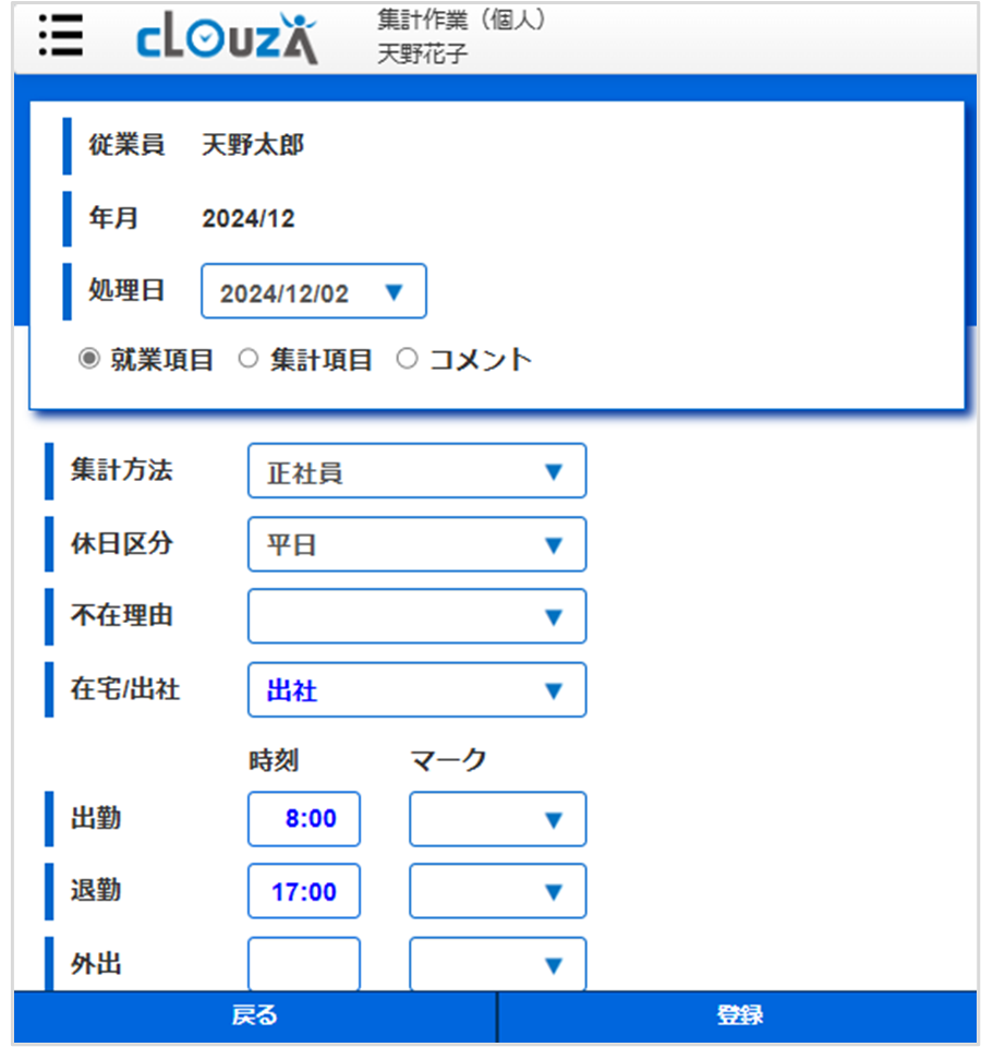 [就業項目]を選択すると、集計方法や打刻、マークなどを確認/修正できます。