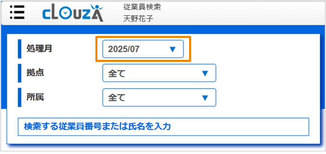 [拠点]/[所属]のプルダウンメニューや、従業員番号/氏名を入力欄を使用して、対象者を絞り込むこともできます。