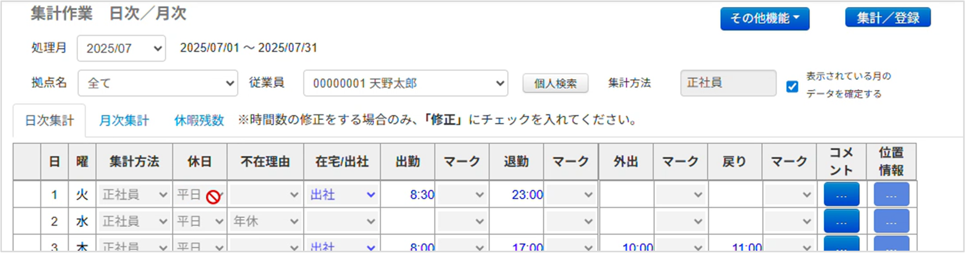 ナビ画面で[集計作業(個人単位)]をクリックしても、同様に[集計作業 日次/月次]画面を表示できます。