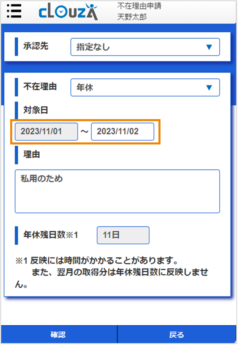 承認が完了するまでは、対象日の背景は青色で表示されます。