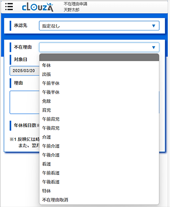 CLOUZAでは、年次有給休暇など、会社にいなかった理由を[不在理由]として扱います。