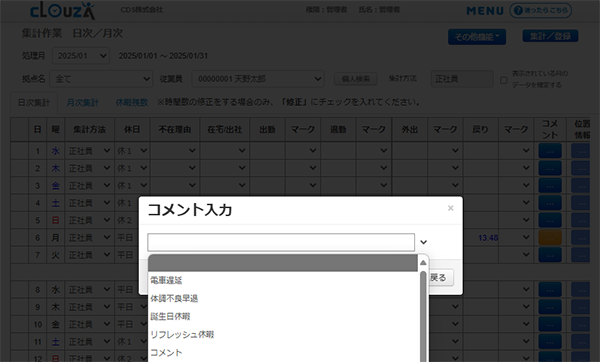 ここで設定したコメントは、[集計作業 日次/月次]画面>[日次集計]タブで定型文として使用できます。