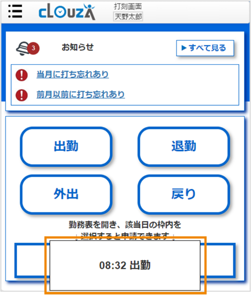 打刻が完了すると、タイムレコーダー画面に打刻結果が表示されます。